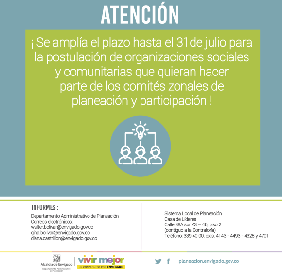 Hasta el próximo miércoles 31 de julio de 2019 el Departamento Administrativo de Planeación amplió el plazo para la postulación de organizaciones sociales y comunitarias que quieran hacer parte de los Comités Zonales de Planeación y Participación.