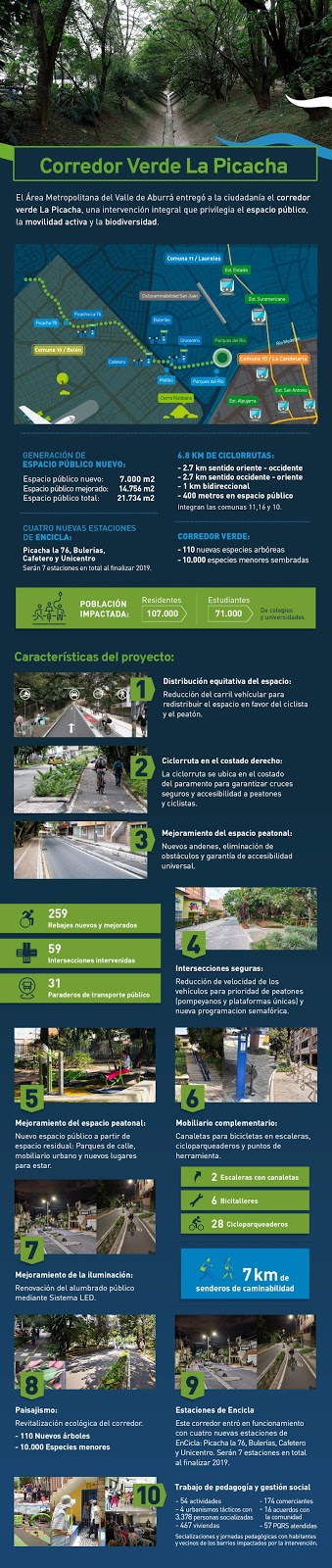 El Área Metropolitana del Valle de Aburrá entregó el corredor verde La Picacha, una intervención integral que privilegia la biodiversidad, el espacio público y la movilidad activa. Este corredor conecta las comunas de Belén y Laureles con el centro de la ciudad, impactando más de 170 mil personas diariamente.