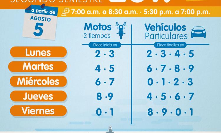 La restricción para carros particulares y motos de dos tiempos continúa de lunes a viernes de 7:00 a 8:30 de la mañana y de 5:30 de la tarde a 7:00 de la noche.