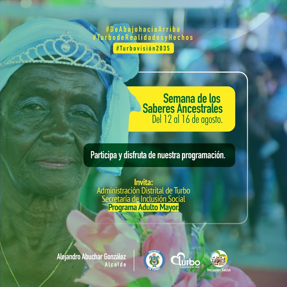 La Administración Distrital de Turbo a través dela Secretaría de Inclusión Social y el programa Adulto Mayor, realzará del 12 al 16 de agosto la semana de los saberes ancestrales.