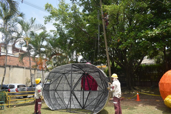 La disposición de las figuras, entre pendones, pasacalles y volumétricos de gran tamaño, es realizada por un equipo conformado por 77 personas, entre cuadrilleros, ingenieros y funcionarios de apoyo logístico. Su labor es secuencial y organizada y comprende la colocación de la infraestructura física (postes, estacones, cables tensores y adecuaciones), ubicación de las figuras o iluminaciones que van en altura (techos de luz e imágenes en árboles), ubicación de figuras volumétricas y puesta a punto de las redes eléctricas.