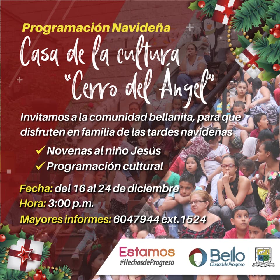La administración municipal de Bello invita a la ciudadanía a disfrutar, a partir de hoy, de la programación navideña en el Centro Casa de la Cultura “Cerro del Ángel”.