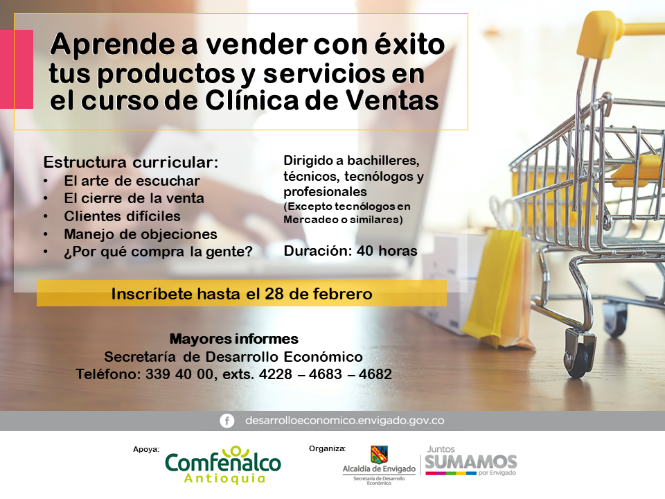 Con el objetivo de formar a los buscadores de empleo en competencias comerciales y de servicio, la Agencia Pública de Empleo de Envigado en apoyo con Comfenalco Antioquia, llevarán a cabo el curso de Clínica de Ventas que inicia el lunes 2 de marzo de 2020, con una duración de 40 horas, y su estructura curricular será la siguiente