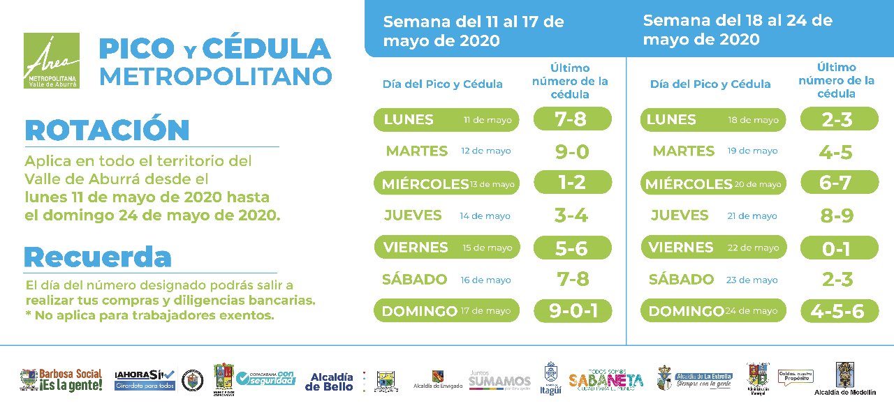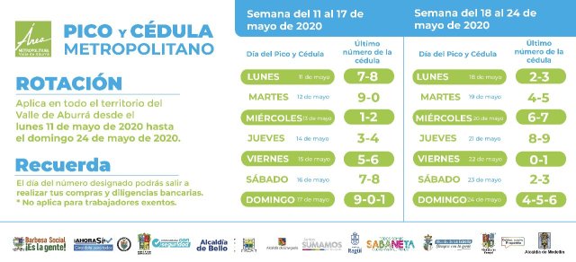 Así será el PicoYCédula metropolitano que aplicará del 11 al 24 de mayo de 2020 en los 10 municipios del Valle de Aburrá.