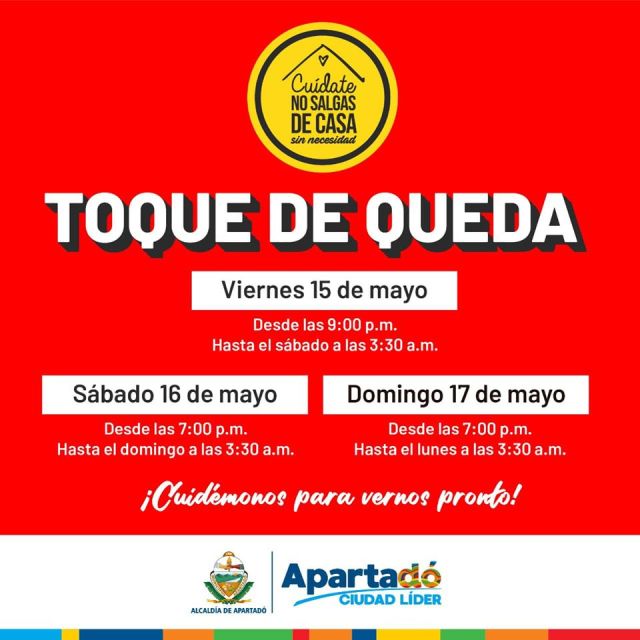 Mediante el Decreto 180 del 15 de Mayo de 2020, se adoptan nuevas medidas para este fin de semana en el marco de la emergencia del COVID-19 en Apartadó.