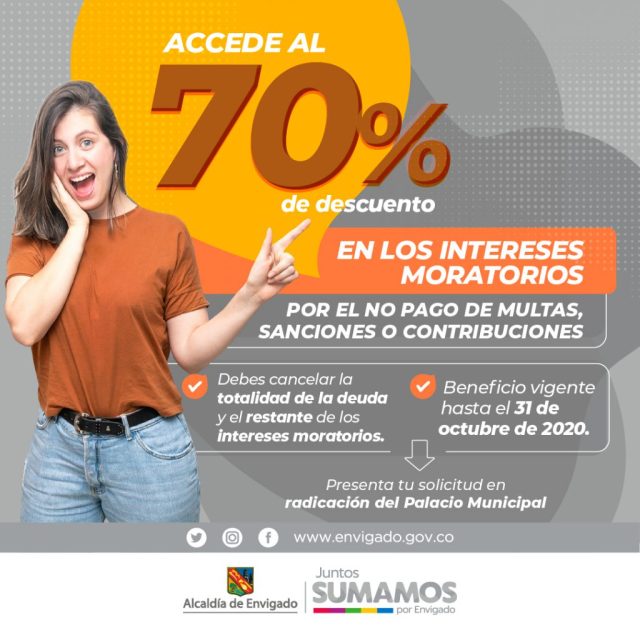El municipio de Envigado quiere facilitarte que te pongas al día en tus obligaciones no tributarias, es así como puedes acceder al descuento del 70% de descuento en los intereses moratorios que se te hayan generado en el no pago de: contribución de valorización, multas de tránsito y urbanísticas, sanciones ambientales y de Policía, y fondos especiales.