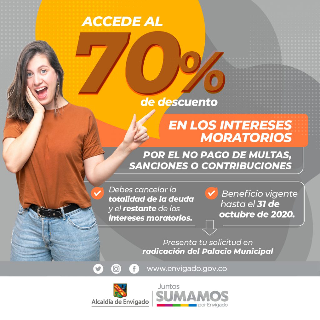 El municipio de Envigado quiere facilitarte que te pongas al día en tus obligaciones no tributarias, es así como puedes acceder al descuento del 70% de descuento en los intereses moratorios que se te hayan generado en el no pago de: contribución de valorización, multas de tránsito y urbanísticas, sanciones ambientales y de Policía, y fondos especiales.