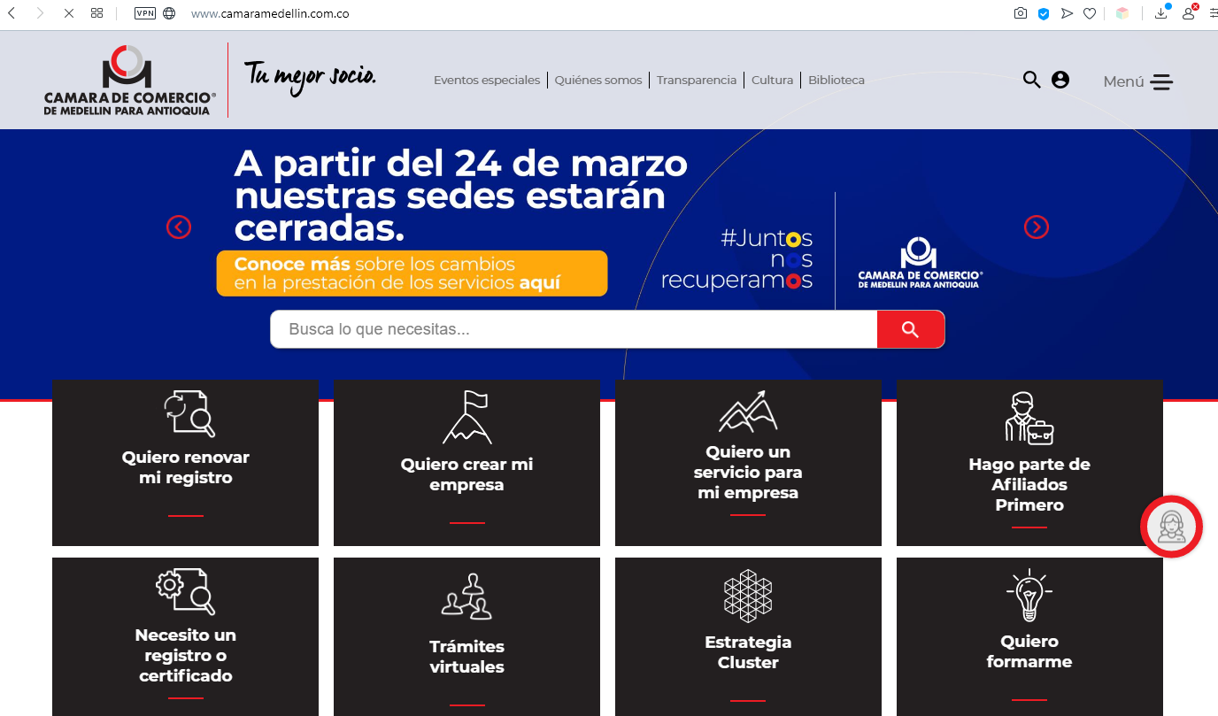 La Cámara de Comercio de Medellín para Antioquia cierra desde este martes 24 de marzo sus sedes físicas en la ciudad de Medellín (El Poblado, Unicentro) y las subregiones Norte, Occidente, Suroeste, Bajo Cauca y la de Bello. Con ello, la entidad busca maximizar la protección y cuidado de sus colaboradores, clientes y ciudadanía en general, y además acata las disposiciones del Gobierno Nacional frente al Covid – 19.
