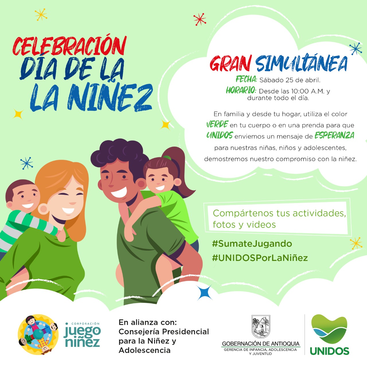 La conmemoración promovida por la Gerencia de Infancia, Adolescencia y Juventud de la Gobernación de Antioquia –GIAJ– se realizará hoy sábado, 25 de abril desde las 9:00 a.m. hasta las 7:00 p.m. en todo el departamento. Además, incluirá distintas actividades simbólicas propuestas para realizar en familia y desde las administraciones municipales de los 125 municipios, con una gran simultánea.