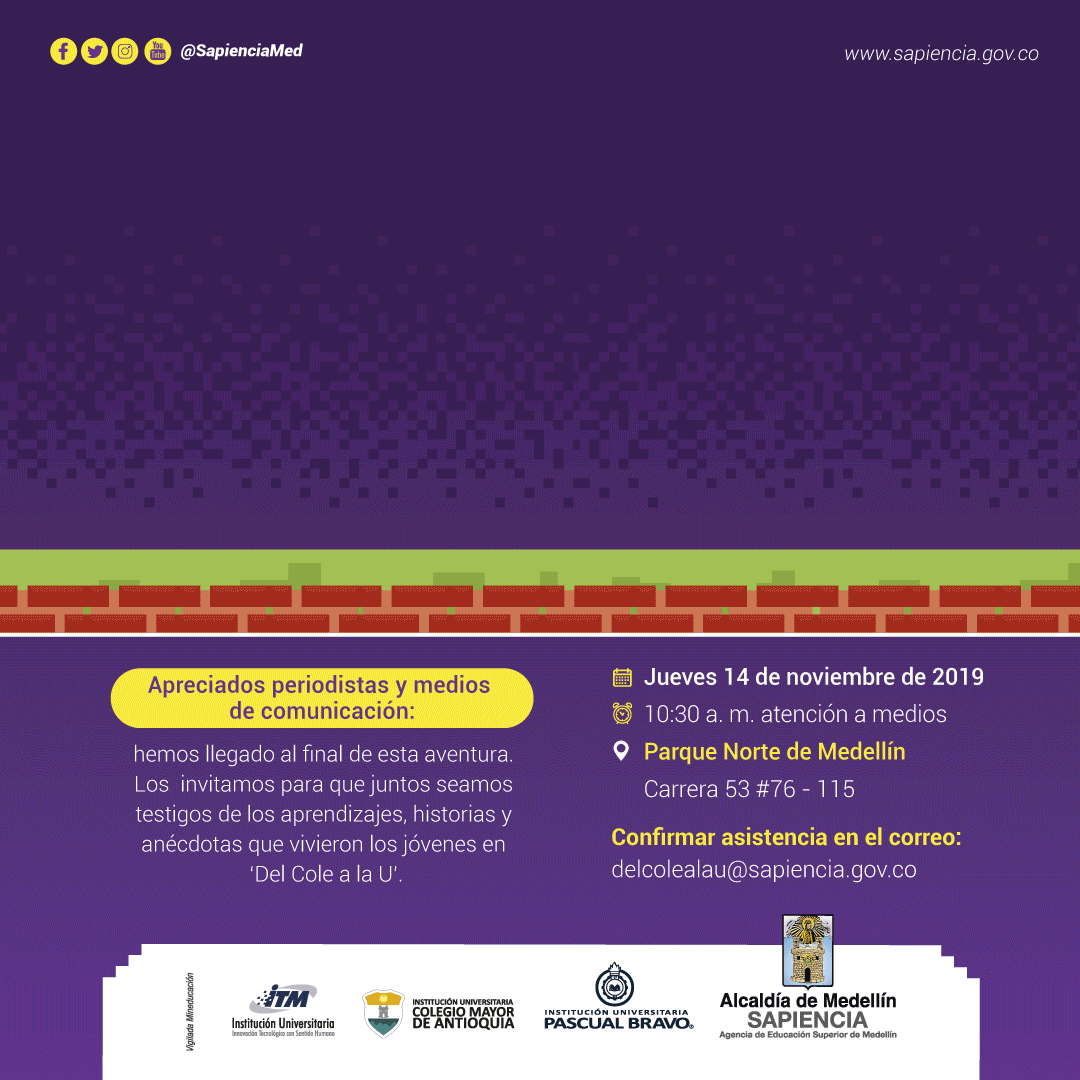 La inversión en la estrategia ‘Del Cole a la u’ 2019 fue superior a los $4.000 millones; una apuesta que buscó generar conciencia sobre el futuro en los jóvenes de Medellín e inspirarlos para que sueñen y decidan hacer de la educación superior parte de su proyecto de vida. Así mismo, pretende que por medio de estas tres instituciones de educación superior se posicione la formación tecnológica en la ciudad y la oferta de becas a través de la Agencia de Educación Superior de Medellín – Sapiencia.