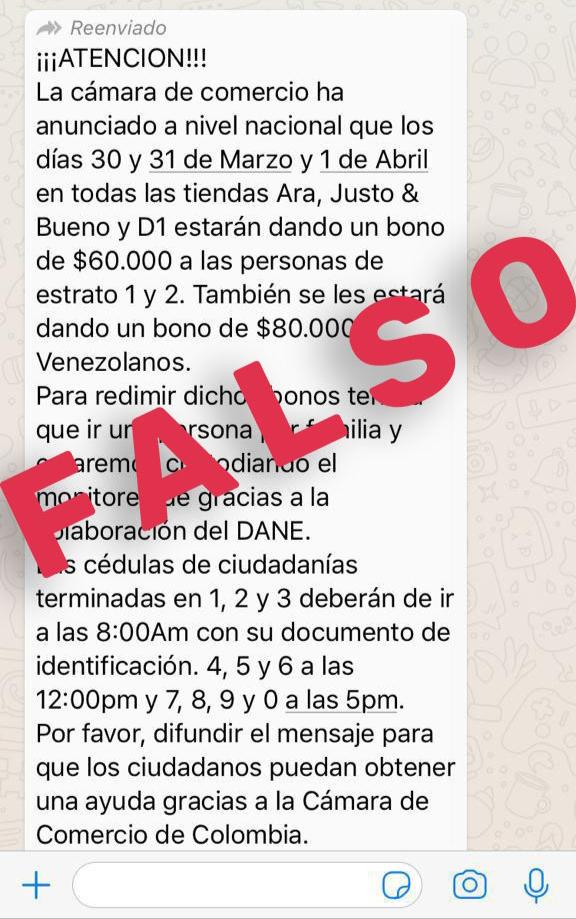 Al respecto, Esteban Restrepo, secretario de Gobierno, precisó: “Es totalmente falso. No jueguen con la esperanza de las personas, no reenvíen cadenas falsas, en estos lugares no están otorgando ni mercados gratis ni bonos” y recordó que, a través de la Secretaría de Inclusión Social, Familia y Derechos Humanos, la Alcaldía de Medellín tiene dispuesto un enlace a través del cual está caracterizando a la población que necesita recibir ayudas económicas, alimenticias o de otro tipo.