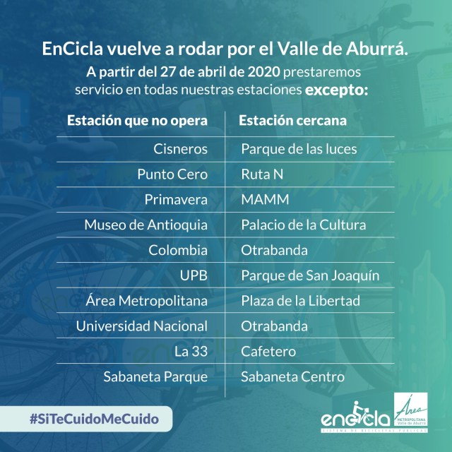 A partir del próximo lunes, el Sistema de Bicicletas Públicas del Área Metropolitana del Valle de Aburrá – EnCicla -, volverá a prestar servicio en 80 de sus estaciones. Esta medida se toma con el fin de brindar soluciones de movilidad para los sectores que se reactivan la próxima semana, así como al personal sanitario del Valle de Aburrá. La operación de nuestro Sistema se reanudará con todas las condiciones de seguridad para nuestros usuarios y colaboradores.