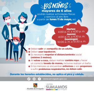 El Gobierno Nacional indicó que se deben determinar las salidas de los menores de edad durante media hora, tres (3) días a la semana, establecidos de la siguiente manera en el territorio envigadeño: