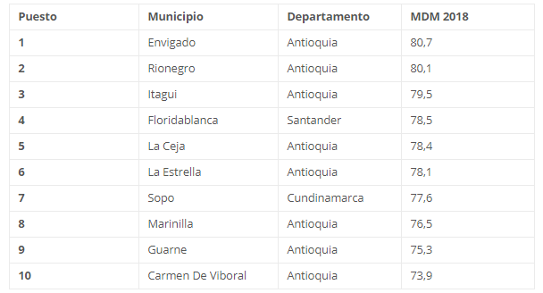 La medición evalúa aspectos como la cobertura y acceso a servicios, gestión de recursos, instrumentos de ordenamiento territorial y gestión pública. Envigado se destacó en aspectos como el aumento del recaudo derivado de las incorporaciones catastrales, la utilización de fuentes alternativas de financiación (valorización, cofinanciación, transferencias de derechos de construcción y obligaciones urbanísticas, entre otros), la inversión de recursos, la creación y ejecución de planes de seguridad y convivencia ciudadana y el mejoramiento en la dotación de espacio público y equipamiento.