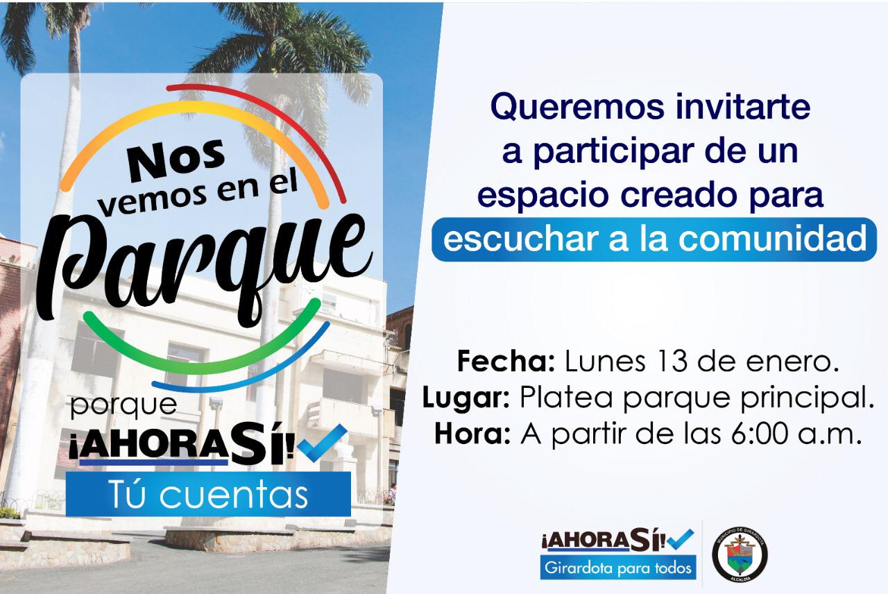 Nos vemos en el parque, porque ¡Ahora Sí, tú cuentas! Un momento en el que el alcalde, Diego Agudelo, atenderá de manera personal y sin cita previa a todos los girardotanos que quieran ser escuchados por él.