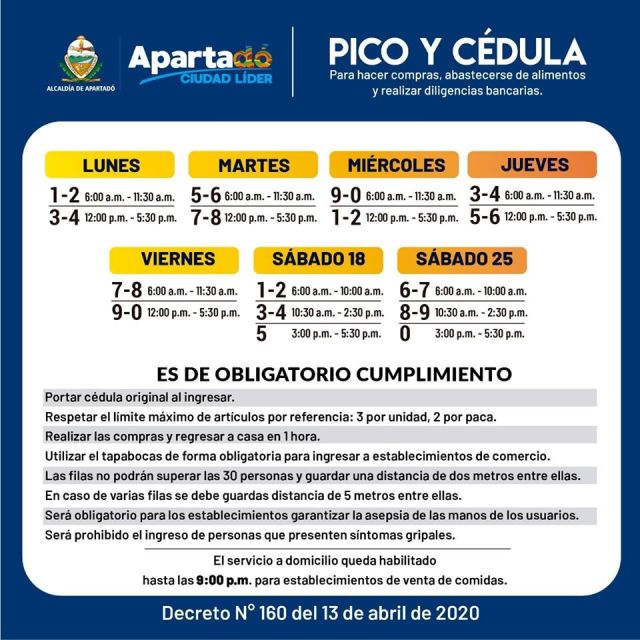Gracias al buen comportamiento de la gran mayoría de los habitantes de Apartadó y atendiendo el clamor ciudadano, se amplian los horarios de pico y cédula en Apartadó. También lo hicimos con el horario para el servicio de domicilio de alimentos. Todo el detalle encuéntralo en la siguiente imagen: