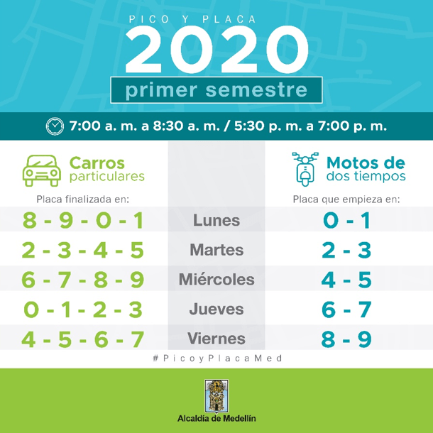 Motos: pico y placa en todo el Valle de Aburrá para motos de 2 y 4 tiempos, en seis (6) dígitos ya definidos de 05:00 a 10:00 y de 16:00 a 20:00 horas.