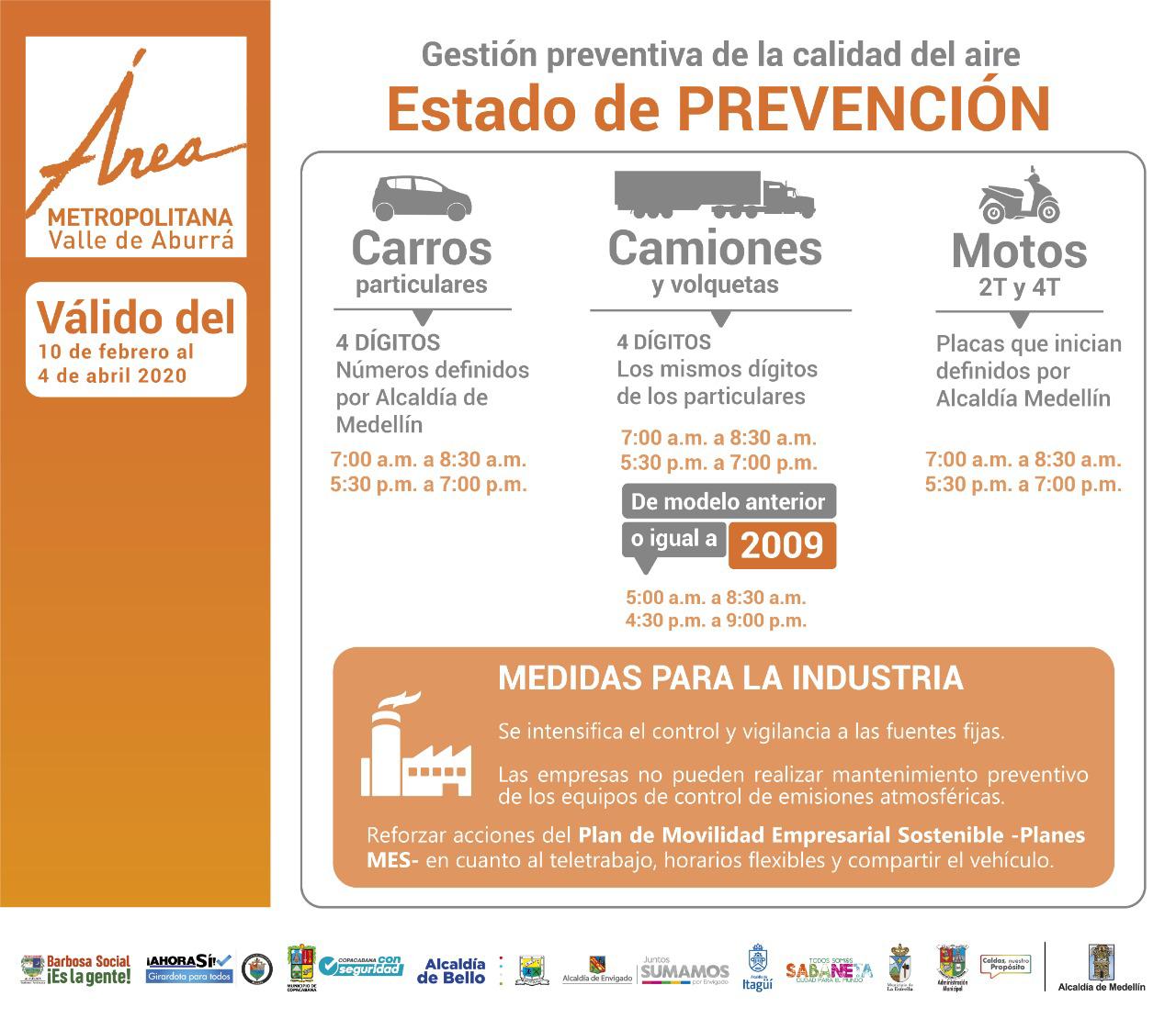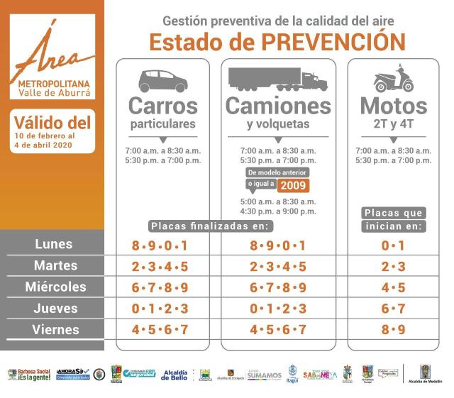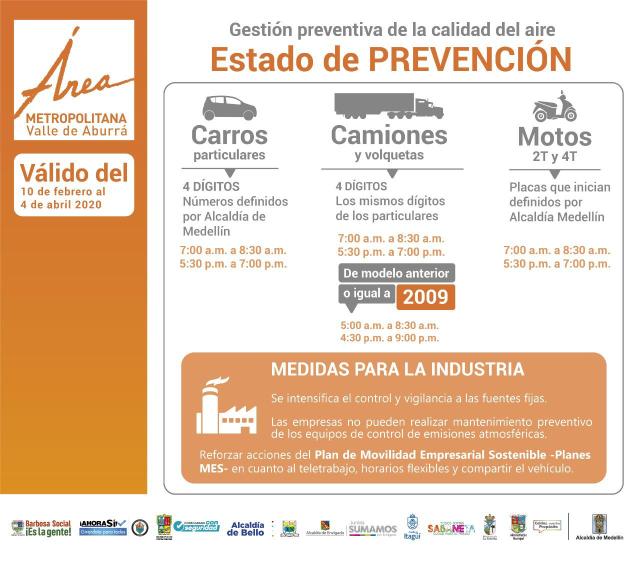 Se da inicio al período de Gestión de Episodios de Contaminación Atmosférica, como ya es conocido por condiciones meteorológicas de transición de temporada seca a temporada de lluvias, declarando el Estado de Prevención en el Valle de Aburrá entre el 10 de febrero y el 4 de abril con las siguientes medidas: