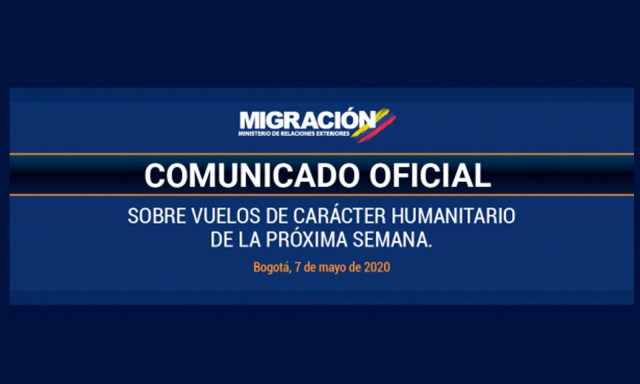 Alrededor de 800 ciudadanos colombianos que no han podido regresar al país, en medio de la pandemia del coronavirus, serán repatriados la próxima semana en nuevos vuelos de carácter humanitario desde siete países.