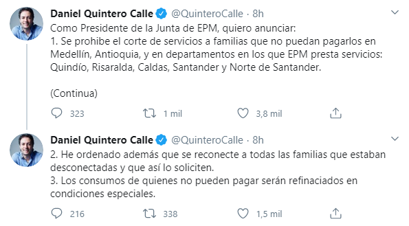 Como Presidente de la Junta de EPM, el alcalde de Medellín anunció tres importantes medidas frente a la contingencia del coronavirus. La prohibición del corte de servicios a familias que no puedan pagarlos en Medellín, Antioquia, y en departamentos en los que EPM presta servicios como: Quindío, Risaralda, Caldas, Santander y Norte de Santander.