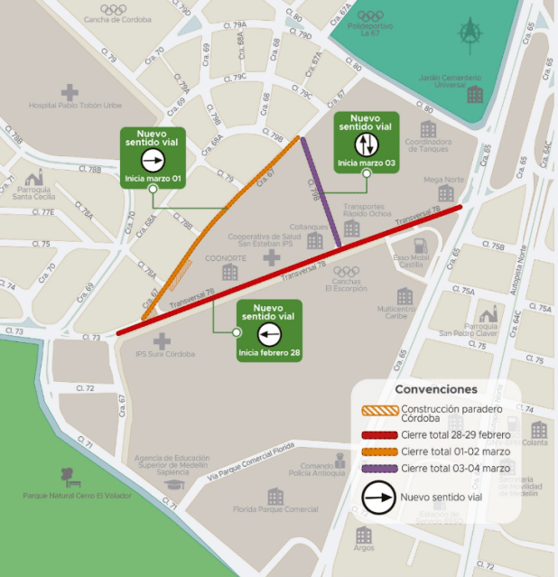 A raíz de la construcción de dos paraderos en el sector de Córdoba, en la comuna 7 (Robledo), la Alcaldía de Medellín anuncia los cambios de sentido vial definitivos sobre la transversal 78, la carrera 67 y la calle 79B.